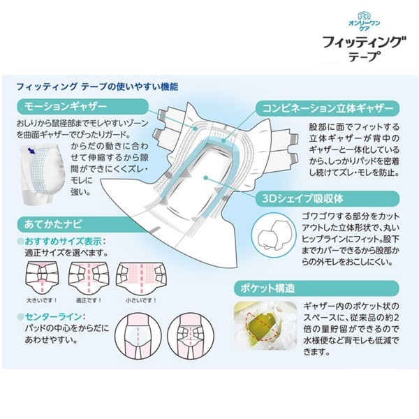 姿勢やからだの動きに合わせて伸縮する新開発の「モーションギャザー」と、立体的に立ち上がる「3D吸収体」で、 これまでにないパンツのような優しいフィット感を実現し、モレをしっかり防ぎます。