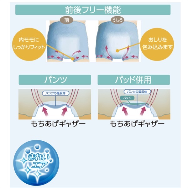 全面伸縮による伸びの良さで、とてもはきやすく、シルクのような柔らか素材で快適なはき心地です。 すばやく吸収+立体ギャザー すばやい吸収力と立体ギャザーで、横モレを防ぎます。